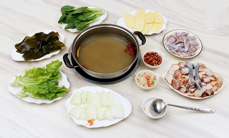 土雞一只、牛蛙兩只、送蔬菜四盤、小菜二碟、米飯隨意